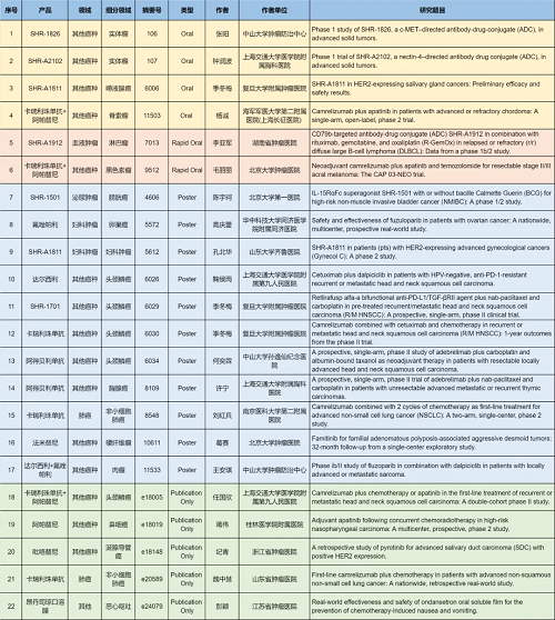 在肺癌、妇科肿瘤、淋巴瘤、膀胱癌、头颈肿瘤、黑色素瘤、肉瘤、鼻咽癌、脊索瘤、唾液腺癌、胸腺癌、硬纤维瘤、涎腺导管癌等其他多个疾病领域,卡瑞利珠单抗、阿帕替尼、阿得贝利单抗、吡咯替尼、达尔西利、氟唑帕利、法米替尼、SHR-1501、瑞拉芙普-α(SHR-1701)、SHR-1826、瑞康曲妥珠单抗(SHR-A1811)、SHR-A1912、SHR-A2102等抗肿瘤创新药相关研究一共入选了4项口头报告、2项快速口头报告、11项壁报展示和4项线上发表,彰显了AG亚游集团医药强劲的研发实力。此外,昂丹司琼口溶膜在防治化疗导致的恶心呕吐方面展现出了良好的疗效,本次ASCO年会有1项研究线上发表。